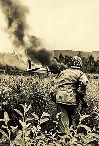 On 4 December, general Lott sent paratroopers to Aragarças, who machine-gunned the tail of one of the C-47 planes, which was returning from an inspection flight in Mato Grosso, and the fuel barrels were bombed. The rebels fled with the other planes to Argentina, Paraguay and Bolivia, and the hostages were released in Buenos Aires. The uprising was put down within 36 hours and nobody was killed. Residents reported that the smoke took weeks to dissipate, and there was a strong smell of burning flesh, even though there were no fatalities.[1][2]