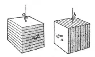 Faraday showed several interesting experiments on eddy-currents. Amongst others he hung from a twisted thread a cube of copper in a direct line between the poles of a powerful electromagnet (Fig. 7). Before the current was turned on the cube, by its weight, untwisted the cord and spun rapidly. On exciting the magnet by switching on the current, the cube stops instantaneously; but begins again to spin as soon as the current is broken. Matteucci varied this experiment by constructing a cube of square bits of sheet copper separated by paper from one another. This laminated cube (Fig. 8) if suspended in the magnetic field by a hook a, so that its laminae were parallel to the lines of the magnetic field, could not be stopped in its rotation by the sudden turning on of the current in the electromagnet; whereas if hung up by the hook b, so that its laminations were in a vertical plane, and then set spinning, was arrested at once when the electromagnet was excited. In the latter case only could eddy-currents circulate; since they require paths in planes at right angles to the magnetic lines.