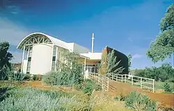 The front window to the arts portion of the centre is a massive, locally made, stained glass work of art which was designed by Wenten Rubuntja and based on his painting Arrernte Country (1987).[2][3]
