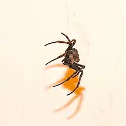 Araneus ventricosus is a nocturnal orb-weaver spider[2] found primarily in China, Japan, and Korea[3] that has been involved in numerous research studies and is easily identified by its nocturnal web-building behavior.[4] Araneus ventricosus' venom is effective against invertebrate prey, but its venom is ineffective in vertebrates.[5] This arachnid's silk has been researched extensively and has several unique properties. For instance, Araneus ventricosus is able to produce flagelliform silk, and its TuSp1 (tubuliform spidroin)[6] and AcSp1 (aciniform spidroin)[7] genes have been sequenced. The spider also has unique eyes that are affected by their circadian rhythm and imply the existence of an efferent optic nerve[8] within the species' central nervous system.