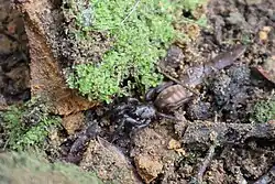 The spiders are fossorial, terrestrial predators. The burrow is constructed in friable soil with a thin trapdoor.[2]
