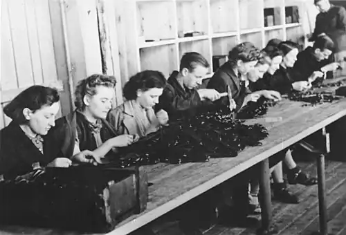 ![]() Mainly female slave labour at a German rifle factory, occupied Poland. An estimated 2,500 German companies employed forced labour during World War II [1] | |