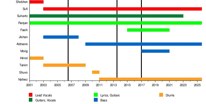 Around mid-2002, Ishtiaq Jishan and Farhan Tanim joined as bassist and drummer respectively. In the same year, Sufi joined as a vocal to complete the lineup.