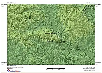 The Arbuckle Mountains are an ancient mountain range in south-central Oklahoma in the United States. They lie in Murray, Carter, Pontotoc, and Johnston counties.[1] The granite rocks of the Arbuckles date back to the Precambrian Eon some 1.4 billion years ago which were overlain by rhyolites during the Cambrian Period. The range reaches a height of 1,412 feet above sea level. According to the U.S. Geological Survey (USGS):[2]