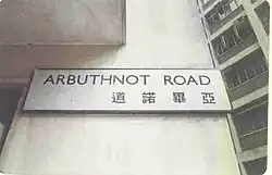 Arbuthnot Road (Chinese: 亞畢諾道) is a road in Central, Hong Kong. The road begins at the Former Central Magistracy, a declared monument of Hong Kong.[1] The road ends at the Hong Kong Zoological and Botanical Gardens.