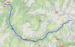 The Arc (French pronunciation: [aʁk] ⓘ) is a 127-kilometre-long (79 mi) river in the Savoie département of south-eastern France.[1] It is a left tributary of the Isère, which it joins at Chamousset, approximately 15 km (9.3 mi) downstream from Albertville. Its source is near the border with Italy, in the Graian Alps, northeast of Bonneval-sur-Arc. The valley of the Arc, the Maurienne, is an important transport artery between France and Italy.