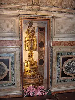 Behind the altar, under the sarcophagus is a small chapel, protected by a bronze grill, containing the precious reliquary with the head of Saint Dominic. This masterpiece of gold and silver is the work of the goldsmith Jacopo Roseto da Bologna (1383). Its octagonal base is adorned with elaborate enamelled panels, related to events in the life of the saint. The shaft consists of three levels. It stands in the middle of a circle with winged angels. The shaft supports an octagonal temple, containing the head. It is adorned with Gothic windows and small statuettes in niches. The silver bust of the Saint crowns the whole, but it was added in a later stage.