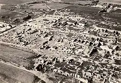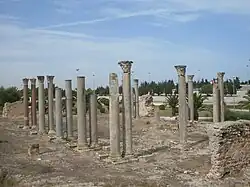 The first constructions of the city were public; they responded to the design of making it an example of Romanity and launching the process of Romanization in this region with a Libyco-Numidian and Punic past.[14] Private installations came only later, with the growing enrichment provided by the numerous exports to Rome: mainly wheat, but also olive oil intended particularly for the cura annonae system. From an administrative city – seat of the procurator — it became an important and prosperous city with a population estimated at 300,000 inhabitants at the time of the Vandal conquest.[15] However, the first Roman city is poorly known due to the successive catastrophes that struck it: earthquakes, fire under the reign of Antoninus Pius.