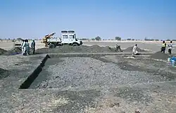 Magnavita's magnetic survey was carried out in the eastern and southern parts of the site using a Fluxgate-Magnetometer FEREX 4.032.[2] The significant distribution of pits at this site were discovered by magnetometry due to the potsherds discarded and/or used in these pits. Some pits were visible or identifiable from the surface due to the abundance of cultural material at the surface (oftentimes broken pottery), but magnetometry allowed for the exact mapping of these pits. This is because fired clay materials generate a magnetic disturbance that contrasts with the surrounding ground material, essentially illuminating the shape of man-made features. Many of these pits were dug for the extraction of clay for craft production, but they were then used for borrowing, refuse, and storage.[2]