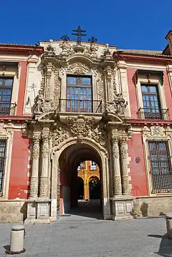 The Archbishop's Palace of Seville (Palacio Arzobispal) is a palace in Seville, Spain. It has served as the residence of bishops and archbishops of the episcopal sees and numerous nobleman and military figures to the present time. It is located in the southern section of Seville,[1] in the Plaza Virgen de los Reyes, angled almost opposite the Giralda.[2] It is situated on the northeastern side of Seville Cathedral in the neighborhood of Santa Cruz. Of Spanish Baroque architectural style,[3] it has had the status of National Monument since 1969.