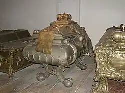 Today's sarcophagus of Leopold Johann in the Imperial Crypt was built in 1740 according to the instructions of Charles VI. Made as an overcoffin for the original coffin, it should be reminiscent of ancient models. A folds of ermine mantle lies over the ornamented lid and on top of it, on a cushion, is the Archducal hat. The coffin was made of tin. The long sides are decorated with angels' heads with spread wings, the coffin itself rests on four bear paws. It was probably created by the Salzburg tin master Hans Georg Lehrl. At the base under a crucifix is a rolled up tablet.[10] The inscription, written in Latin, reads in translation:
