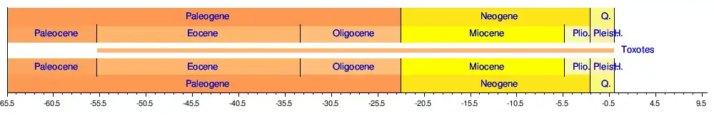 - ^ Girard, M G; Davis, M P; Tan, H H; Wedd, D J; Chakrabarty, P; Ludt, W B; Summers, A P; Smith, W L (2022). "Phylogenetics of archerfishes (Toxotidae) and evolution of the toxotid shooting apparatus". Integrative Organismal Biology. 4 (1): obac013. doi:10.1093/iob/obac013. PMC 9259087. PMID 35814192.