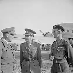 On 20 May 1939, Nye was promoted to colonel, with the temporary rank of brigadier, and sent to India to raise a brigade, commanding the Nowshera Brigade from May 1939 to January 1940.[18][19] In February 1940 he returned to London to take up the post of deputy director of Staff Duties, War Office and became Director of Staff Duties with the acting rank of major-general from 1 November.[20] Promoted to substantive major-general on 18 November 1941, in December he became Vice-Chief of the Imperial General Staff under Sir Alan Brooke with the acting rank of lieutenant-general from 5 December.[21][22] The enormous burdens placed on Brooke meant that he needed to delegate many of his tasks and for this he relied heavily on Nye. The partnership was highly successful and Nye remained in the job for the rest of the war.[23] It could be said that while Brooke ran the war, Nye ran the army.[24] Advanced to the temporary rank of lieutenant-general on 5 December 1942, in the 1944 Birthday Honours Nye was knighted as a Knight Commander of the Order of the British Empire, the first of five knighthoods he would ultimately be conferred with.[25][26] He was promoted to the substantive rank of lieutenant-general on 14 September 1944.[25][27] Nye retired on 29 March 1946.[28]