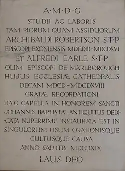 In his academic career, Robertson was a specialist in patristics and church history, in which field he was widely published and respected.[4] He was elected Bishop of Exeter on Easter Monday (13 April) 1903,[11] consecrated (ordained) as a bishop on 1 May (by Randall Davidson, Archbishop of Canterbury, at St Paul's Cathedral) and enthroned and installed at Exeter Cathedral on 5 May;[12] he legally took up the See upon the confirmation of his election, which took place between his election and consecration (i.e. during April 1903). In 1912 Lollards Tower on the Exeter City Wall was rebuilt and several sculpted stone tablets displaying the arms of Bishop Robertson were set into the walls, including one over the arched entrance known as Bishop Carey's Postern.[13] He served as diocesan bishop until 1916,[2] when he resigned due to ill health, retiring to Oxford, where he died at home in 1931.[4]