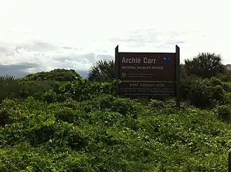 The Archie Carr National Wildlife Refuge is part of the United States National Wildlife Refuge (NWR) System, located along a twenty-mile (30 km) section of coastline from Melbourne Beach to Wabasso Beach, Florida, along State Road A1A. The 900 acre (3.6 km2) refuge was established in 1991, to protect the loggerhead and green sea turtles.