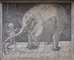 In the 1930s, several houses at 9, 10, and 26 Rynek Street were remodeled. The old house at 9 Rynek Street was demolished in 1925, and a new one was built on two plots.[13] Like the neighboring house at No. 10, the buildings maintained an ahistorical style with modest decoration reduced to narrow cornices. The façade of the house at 26 Rynek Street took on forms characteristic of the 1930s, with large semi-circular windows on the first floor.[13] The façade of the building from 1639 was decorated with sgraffito, depicting the elephant Hansken with its keeper. The painting was likely created due to an event related to the animal's performance in Trzebiatów (the first in Pomerania).[13] Examples of modernist architecture from the 1940s also appeared (e.g., the house at 2 Szkolna Street, built of ceramic bricks, with a simple cubic form and brick façade).[1]