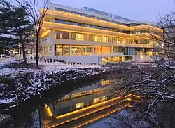 Contemporary architecture is a wide-ranging architectural category prominent in the 21st century. Although no single style dominates this motif, contemporary architecture generally uses large glass panes and intricate, often asymmetric form to depict abstract concepts or themes. Many of the residential and office buildings constructed in Washington in the 2010s and 2020s around places such as CityCenterDC, Navy Yard, the Wharf, and throughout the Downtown portions of the city are contemporary in design, with glass and metal façades. Examples of contemporary architecture include the renovation of Arena Stage on the Southwest Waterfront, the translucent canopy over the Kogod courtyard of the Old Patent Office Building in Chinatown, the Embassy of Sweden and Iceland (known as the House of Sweden) in Georgetown, and the building housing the International Spy Museum in L'Enfant Plaza.