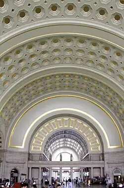 Washington Union Station, the city's main train station, opened in 1908. It was designed by Daniel H. Burnham, who used numerous architectural styles to create the structure. The ceiling of the Great Hall is made of gold leaf symmetrical patterns, while neoclassical elements, such as columns and statues, line the interior and exterior of the building.