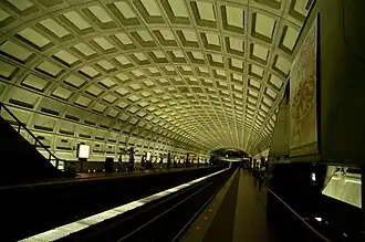 Examples of such buildings are the Hirshhorn Museum on the National Mall, the James V. Forrestal Building in Southwest D.C., the Washington Hilton near Kalorama, the Robert C. Weaver Federal Building in Southwest D.C., and the J. Edgar Hoover Building located Downtown. Additionally, the interior ceilings of the Washington Metro are built with a brutalist design, characterized by low lighting, symmetry, and abstract rectangular shapes made of concrete slabs.[21]