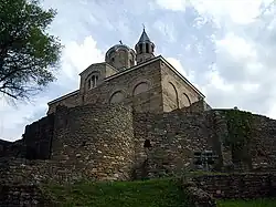 According to the number of naves the churches were one-naved (Church of St Demetrius of Thessaloniki, Veliko Tarnovo in the Asen's Neighbourhood, Tarnovo, Boyana Church), two-naved ("St Ivan of Rila" in Trapezitsa, Tarnovo) and three-naved (SS. Forty Martyrs Church in Tarnovo, "St Nicola" in Melnik). In the cruciform dome churches (Church of St John Aliturgetos and Church of Christ Pantocrator, both in Nessebar) the dome lied over four columns which were connected to the walls with arches. The altar was formed by a semicircular or polygonal apse. In some churches the altar was separated into three parts and the external ones (called bema and diakonnik) were used for safe-keeping of the church plates, garments and books. In that case there was usually a triple apse. The design was complicated by a pre-apse space. The vaults were semicircular and built of bricks. Some churches had outhouse parts such as galleries (SS. Forty Martyrs Church and "St Peter and Pavel" in Tarnovo), chapels (Boyana Church), ossuaries and others. The Church "St Virgin Maria of Petrich" in the Asenova krepost has two stories and the lower one served as an ossuary.[1]