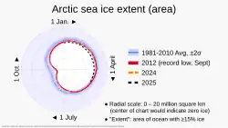 - ^ "Charctic Interactive Sea Ice Graph / A Sea Ice Today Tool / Arctic Sea Ice Extent". nsidc.org. National Snow and Ice Data Center (NSIDC), a part of CIRES at the University of Colorado Boulder. April 2025. Archived from the original on 26 April 2025. (Hover mouse over data traces to view individual data values.)