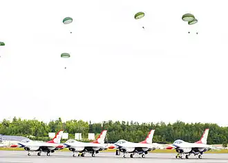 ![]() Army paratroopers land adjacent to the F-16 fighters of the Thunderbirds as part of the Alaska Joint Forces demonstration. | |