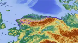 This is a hilly area that lies between the boggier Arctic coastal tundra to the north and the Brooks Range to the south, and stretching from the Chukchi Sea east across northern Alaska to the border with Canada's Yukon Territory. The Noatak River valley is the only forested area.[2]