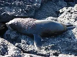 The Galápagos fur seal (Arctocephalus galapagoensis) is one of eight seals in the genus Arctocephalus. It is the smallest of all eared seals. It is endemic to the Galápagos Islands in the eastern Pacific. The total estimated population as of 1970 was said to be about 30,000, although the population has been said to be on the decline since the 1980s due to environmental factors such as pollution, disease, invasive species, and their limited territory. Due to the population having been historically vulnerable to hunting, the Galápagos fur seal has been protected by the Ecuadorian government since 1934.[3][4]