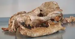 The family Arctocyonidae was named by Christoph Gottfried Andreas Giebel in 1855, as a carnivoran subfamily that included Arctocyon, the amphicyonid Amphicyon, and the ursid Agriotherium.[2] It was elevated to family level by Scottish zoologist Andrew Murray.[3] At some point thereafter, arctocyonids became a family within Creodonta.[4] In 1975, Malcolm McKenna erected a new order, Arctocyonia, to accommodate them, placing them within Ungulata.[5] Since then, Arctocyonidae has largely been treated as a family of its own, though how that family is divided has been another matter. William Diller Matthew, in 1937, divided it into four subfamilies (Arctocyoninae, Chriacinae, Oxyclaeninae, and Triisodontinae);[6] the latter is now regarded as a family of its own. That same year, George Gaylord Simpson suggested that arctocyonids could instead be divided into Arctocyoninae, Oxyclaeninae, and Triisodontinae.[7] In 1978, Leigh Van Valen erected a new subfamily, Loxolophinae.[8]