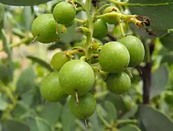 The oval leaves are up to 5 centimeters long and 3.5 wide and are hairless and somewhat waxy in texture. The inflorescence is a hanging cluster of white urn-shaped flowers each about 6 to 8 millimeters long. The fruit is about a centimeter wide and ripens to a dark purple-brown.