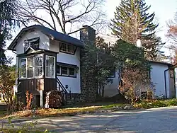 There are six named houses in Arden designed by William Lightfoot Price: Friendly Gables (built 1909), 2205 Little Lane; The Lodge (1910), 2209 The Sweep; Rest Cottage (1910), 2328 Cherry Lane; Green Gate (1909), 2210 The Sweep; The Second Homestead (1909), 2311 Woodland; and The Fels House (1909), 2110 Orleans Road.[11] Price also designed the Arden Craft Shop in 1913. His designs are generally Elizabethan Revival and show the influence of the Arts and Crafts movement. The first houses built in Arden were small summer cottages that have been destroyed, or in a few cases greatly enlarged. Small worker's cottages were also built after the completion of the Craft Shop. Price may have participated in the designs of both these forms as well. Residents often designed, built and named their own cottages. Upton Sinclair's cottage was built with funds from Joseph Fels and named by other residents "Jungalow."[12]