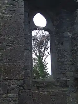 The site has three medieval church ruins, the main and earliest building being from the 12th century. Within the adjoining graveyard there are two other churches, Temple Na Hoe dating from the 12th century and Temple Na Griffin dating from the 15th century. Over 2,000 burials were found when the site was excavated[2] The main church has an ogham stone and a number of early Christian and medieval grave slabs. In the 15th century, a small transept was added and battlements were constructed. During the Reformation in Ireland, the established Church of Ireland became Protestant. The cathedral roof was destroyed during the Irish Rebellion of 1641,[3] but the south transept was re-roofed and extended later in the 17th century. From 1663 the diocese was united with the Diocese of Limerick and the former cathedral became a parish church. In 1871, when a new Church of Ireland church was opened, the cathedral's roof was again removed. After the 1871 disestablishment of the Church of Ireland, its disused historic sites, such as Ardfert Cathedral, were transferred to the Board of Public Works, now the Office of Public Works. Part of the transept has been restored, and houses the entrance and a gift shop.[4]