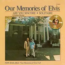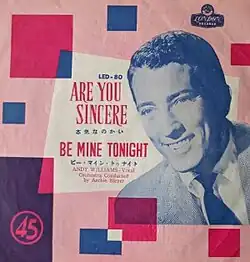 "Are You Sincere" is a song written by Wayne Walker, originally released in 1957. Andy Williams recorded the song, which Cadence Records issued as a single in 1958, with an orchestra conducted by Archie Bleyer. Since Williams' success, the song has been covered many times in pop and country styles. Notable covers include versions by: The Platters (1959), Eddy Arnold (1961), Gene McDaniels (1961), Marty Robbins (1961), Lenny Welch (1963), Trini Lopez (1965), Ray Anthony (1968), Bobby Vinton (1969), Brook Benton (1970), Jean Shepard (1973), Elvis Presley (1973), Mel Tillis (1979), and Charley Pride (1986).