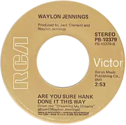 "Are You Sure Hank Done It This Way" is a song written and recorded by American country music artist Waylon Jennings. It was released in August 1975 as the first single from the album Dreaming My Dreams. An outlaw country anthem, the song was Jennings' third number one on the country chart as a solo artist, spending sixteen weeks on the chart.[2]