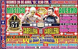 The main event of the six-match show was for the vacant Mexican National Welterweight Championship between tecnico Místico La Nueva Era and the rudo Averno. The Mexican National Welterweight Championship was vacated on March 20, 2013, when the then-Champion Titán had to relinquish the title due to an injury.[3] CMLL held a 10-man Torneo cibernetico, elimination match on the April 19, 2013, Super Viernes where the last two wrestlers in the match would face off on the Arena Mexico 57th Anniversary Show to determine the new champion. The elimination match included Averno, Fuego, Guerrero Maya, Jr., Místico La Nueva Era, Namajague, Rey Cometa, Tiger, Valiente, Volador Jr. and Sangre Azteca.[4] Of the group Valiente and Sagre Azteca have held the Welterweight championship before. Of the ten competitors Sange Azteca and Valiente had both held the Mexican National Welterweight Championship.[5] The Torneo Cibernetico saw Sangre Azteca eliminated as the first man by Fuego, followed by Guerrero Maya, Jr. (by Volador Jr.), Fuego (Tiger), Namajague (Disqualified for a low blow against Rey Cometa), Rey Cometa (by Averno), Tiger (by Valiente), Valiente (by Volador Jr.) and finally Volador Jr. was pinned by Místico, leaving Místico and Averno as the last two competitors.[6][7] Averno had a long history with the character Místico, that had left CMLL in 2011 and Místico La Nueva Era was created to follow in his footsteps.