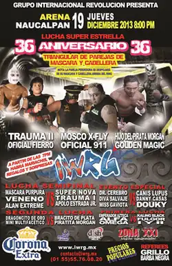 In late 1995 Adolfo Moreno decided to create his own promotion, creating a regular roster instead of relying totally on wrestlers from other promotions, creating the International Wrestling Revolution Group (IWRG; sometimes referred to as Grupo Internacional Revolución in Spanish) on January 1, 1996.[7] From that point on Arena Naucalpan became the main venue for IWRG, hosting the majority of their weekly shows and all of their major shows as well.[8][9] While IWRG was a fresh start for the Moreno promotion they kept the annual Arena Naucalpan Anniversary Show tradition alive, making it the only IWRG show series that actually preceded their foundation.[9] The Arena Naucalpan Anniversary Show is the fourth oldest still ongoing annual show in professional wrestling, the only annual shows that older are the Consejo Mundial de Lucha Libre Anniversary Shows (started in 1934),[10] the Arena Coliseo Anniversary Show (first held in 1943),[11] and the Aniversario de Arena México (first held in 1957).=[12]