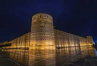 Karim Khan Citadel is located at Shahrdari Square. It has a land area of 4,000 m2 and is in the center of a 12,800 m2 compound.[2] It consists of four high walls connected by four 14 m round brick towers at a 90-degree angle. Each 12 m wall is 3 meters thick at the base and 2.8 meters at the top.[2][3] The design of the citadel combines military and residential architecture, for it was the home of Karim Khan and the military center of the dynasty.[3]