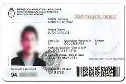 The Argentina foreigner's identity card (Spanish: DNI para Extranjeros)[1] was a document issued to non-Argentine citizens living in Argentina.