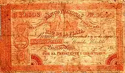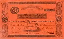 ![]() "Cinco pesos" moneda corriente banknote, issued in 1869 | |