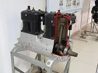 It had a bore of 124 mm (4.88 in) and a stroke of 130 mm (5.12 in) and produced about 45–55 hp (34–41 kW) at 1200–1300 rpm[3][4] and was produced in two variants, with the valves and camshaft on the right[3] or on the left side[5] respectively.