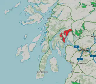![]() A map showing the location of the Argyll Forest Park (in red, other forests parks shown in green). | |