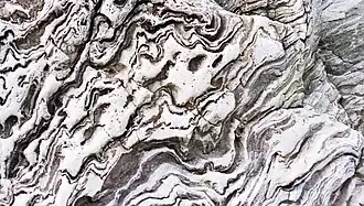 ![]() Folded and metamorphosed limestone of the Boyne Bay Formation of the Tayvallich Subgroup (the upper part of the Argyll Group) in Boyne Bay, Aberdeenshire | |