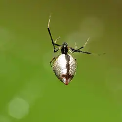 Argyrodes elevatus spiders' small bodies can be divided into two regions: the cephalothorax, which consists of the head and legs, and the abdomen. The head is usually a dark color, ranging from brown to black.[1] The legs extending from this division are a lighter brown, with the ends of the legs returning to the darker color similar to the head. The second division, the abdomen, has a silver, bulb-like, conical appearance with a dark line extending down the length of the spider. With the two divisions combined, the spider is approximately 4–7 mm in length.[1]