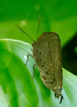 It is above in the male deep dark blue. Beneath the spots of the proximal half of the wing are larger, rounder, and the white bordering is more distinctly prominent in the shape of distinct rings. The postmedian transverse band of the hindwing is in the female three times interrupted, in the male which is beneath more red-brown, at the places of interruption strongly notched. In the form anicius Fruhst. the white, hoary covering of the under surface is particularly intense, so that the very narrow longitudinal stripes extending in the direction of the veins are very prominent. This form resembles Arhopala adherbal.[3]