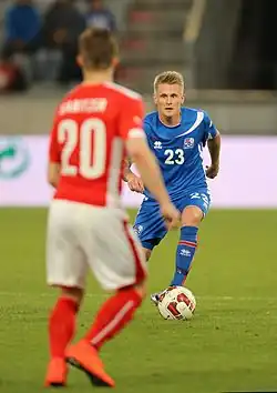 After being capped at various youth levels he got to make his debut for the Icelandic national team in 2009 against Iran.[14] In 2012, he started getting more frequent callups from new national team manager Lars Lagerbäck.[15] Despite Ari having been playing as a midfielder for his club side he was nonetheless picked in the Iceland squad as a left-back and has been the first-choice left-back in the national team during most of the 2014 World Cup qualifiers.[16][17] Consequently, Ari felt that he needed to change his position at club level and asked to be signed as a left-back when he was sold in July 2013, so he could play that position at club level to be able to hold his place as the first-choice left-back in the Iceland squad, despite the fact that he has been praised as a central playmaker of high quality.[16]