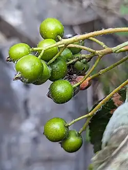 This species grows as a shrub or small tree, growing to a height of about 5m. It has obovate leaves ; these are shiny green above, and as with all whitebeams, are whitish below. Flowers are white, while the fruits are red globose berries ca.1cm across, usually dappled with pale lenticels.[2]