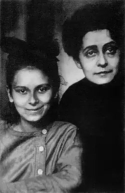 At 15, she was composing verses together with her sister Marina under the collective pseudonym Mirra. Those verses were often devoted to Russian names and followed the style of Marina Tsvetaeva, who was a family friend.[21] When writing alone, Ariadna used the pen name Ariadna Orlitskaya – while she adored her father, she did not want to ride on his fame.[22]