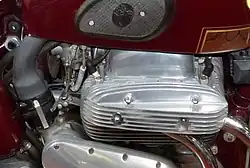 In 1949, the Ariel Square Four Mark I saw the cast-iron cylinder head and barrel replaced by the alloy head and barrel.[8] This saved about 30 pounds (14 kg) in weight. The 1949 machine weighed around 435 lb (197 kg) dry, produced 35 bhp (26 kW) at 5,500 rpm.[6] The Mark I was capable of 90 mph-plus.