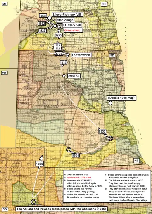 - ^ Meyer, Roy Willard (1977). The village Indians of the upper Missouri: the Mandans, Hidatsas, and Arikaras. University of Nebraska Press. p. map facing p. 112. ISBN 0-8032-0913-4.