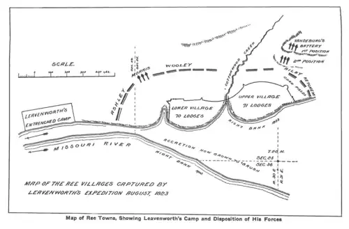 On 9 August 1823, Leavenworth arrived at the Arikara villages and commenced the attack using his Sioux cavalry, but this was held off by the Arikara. On 10 August, Leavenworth ordered an artillery bombardment. This was largely ineffective, the shots falling beyond the villages, at which point Leavenworth ordered an infantry attack. Like the Sioux auxiliaries, the regular infantry also failed to break into the villages. They left the battlefield with some captured horses and laden with corn taken from the farming Indians' fields.[19]